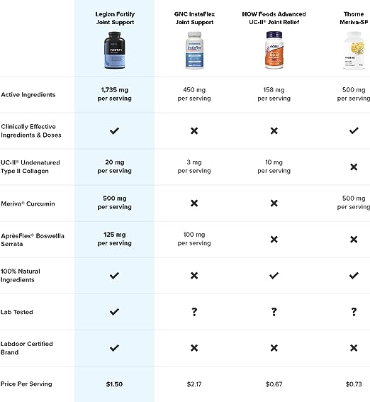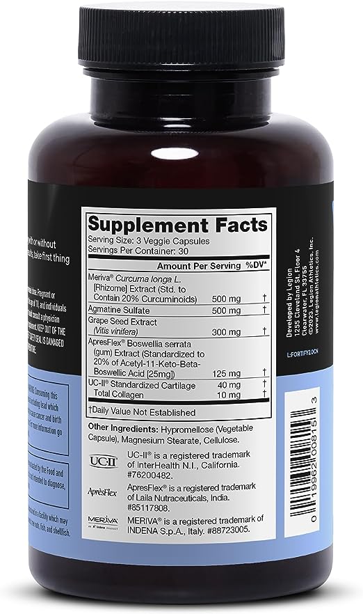 Legion Fortify Joint Support - Suplemento totalmente natural para aliviar el dolor articular con colágeno tipo II no desnaturalizado (UC-II) suplementos de curcumina para mejorar la salud y la función de las articulaciones (30 porciones, 90 cápsulas)