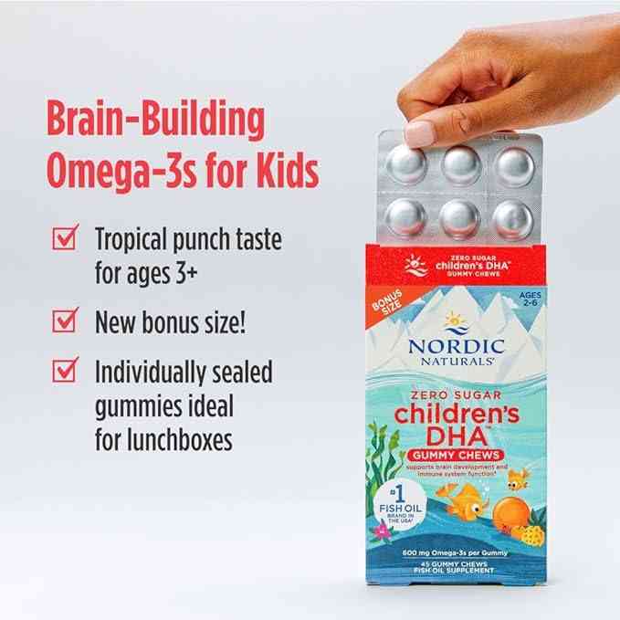Nordic Naturals Zero Sugar - Gomitas masticables de DHA para niños, Tropical Punch, 45 gomitas masticables para niños, 600 mg de omega-3 totales, desarrollo cerebral, aprendizaje, inmunidad saludable,