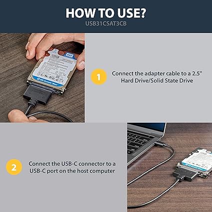 - ACCESO DE ALIMENTACIÓN EXTERNO Este adaptador USB C a SATA le permite acceder rápidamente a su SSD o HDD SATA de 2.5'' sin necesidad de accesorios adicionales.