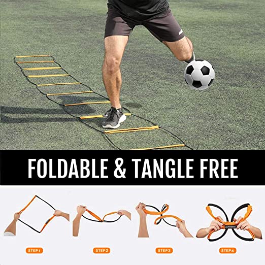 - ✔ Equipo de entrenamiento multifuncional nuestro diseño patentado cuenta con tres productos en uno escalera, obstáculo y pared. Con anillos deslizables y velcro extensible, puedes ajustar libremente la escalera de entrenamiento a varias formas para practicar más pasos, mientras que reduce la cantidad de equipo para ser transportado a cada lugar de entrenamiento. Ahora puedes darle a tu equipo una nueva dimensión y formas más emocionantes de desarrollar velocidad, agilidad y coordinación.