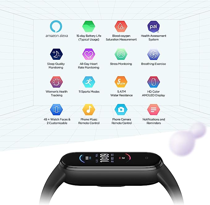 Amazfit Band 5 - Monitor de actividad física con Alexa incorporado, duración de batería de 15 días, oxígeno en sangre, frecuencia cardíaca, monitoreo del sueño, seguimiento de la salud de las mujeres, control de música, resistente al agua, negro (modelo S2005OV1N)