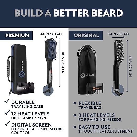 Arkam Alisador de barba para hombre, kit de cepillo de barba con calefacción de alta calidad con función antiquemaduras, peine de pelo de doble acción y funda de viaje rígida para barbas medianas a