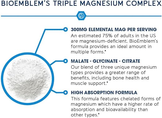 - Máxima absorción y suplemento de magnesio potente el complejo de magnesio triple BioEmblem cuenta con 300 mg de tres tipos de magnesio puro (glicinato, malato, cirato). Cada uno es quelato o altamente absorbente para una máxima biodisponibilidad. Nuestra fórmula es fácil para el estómago y "no amortiguada", lo que significa que esta mezcla no se diluye con óxido de magnesio menos caro y menos absorbente. *