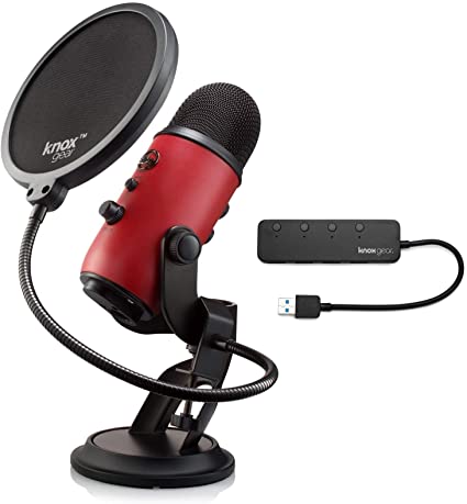 Blue Microphones Yeti - Micrófono USB (rojo satinado) con filtro Knox Gear Pop y 3.0 4 puertos USB Hub Bundle