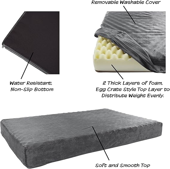 - Máximo confort y apoyo nuestro inserto de espuma extra gruesa de 4 pulgadas consta de 2 pulgadas de espuma viscoelástica de alta calidad y 2 pulgadas de espuma para distribuir el peso de la caja de huevos. Esta combinación única proporciona la máxima comodidad y apoyo para perros de todas las edades y tamaños. A los perros y gatos les encantará esta cama en perfecta salud, así como a aquellos que sufren de artritis, rigidez muscular, displasia articular y de cadera.