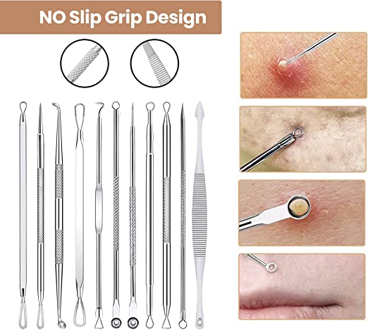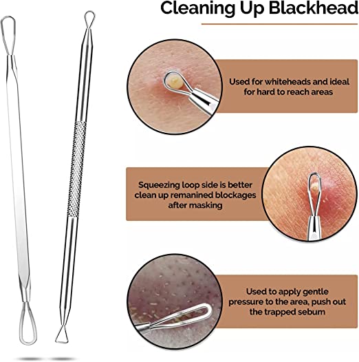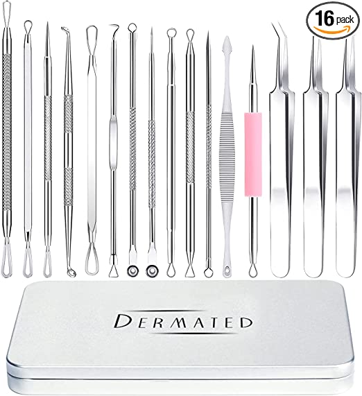 - Kit multifuncional ya sea en casa o profesional, este kit de herramientas de 16 piezas ayuda con la eliminación completa del acné, puntos negros, puntos blancos, comedones, espinillas y gránulos de grasa sin la necesidad de usar los dedos