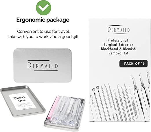 Dermated Kit de herramientas para remover puntos negros, extractor de comedones, kit de eliminación de acné para manchas, herramientas de acné inoxidables para acné y eliminación de zit para herramientas de nariz y cara en caja de metal