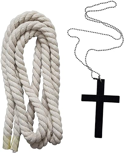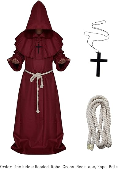 - El pedido incluye Túnica con capucha + cinturón de cuerda (67 pulgadas aproximadamente) + collar de cruz (horizontal 2.75 pulgadas, vertical 3.8 pulgadas).