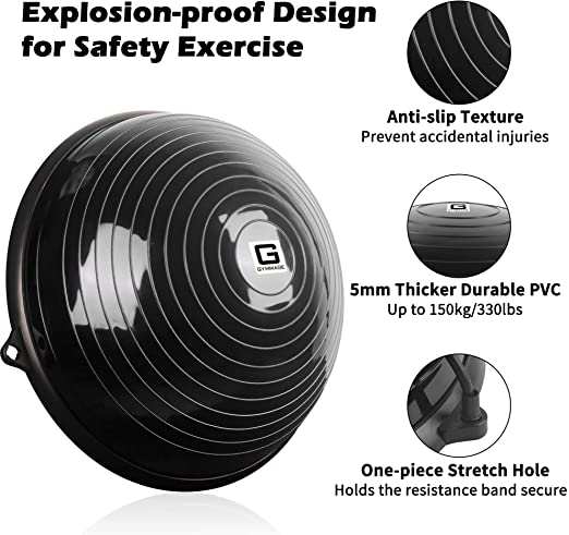 - Respetuoso con el medio ambiente y duradero fabricado con materiales de PVC no tóxicos, la media bola es hipoalergénica, duradera y fácil de limpiar. La superficie de la media bola es de diseño ondulado, lo que la hace antideslizante. La bola es a prueba de explosiones porque tiene aproximadamente 0.24 pulgadas de grosor, lo que garantiza un uso a largo plazo y es antiexplosiones.
