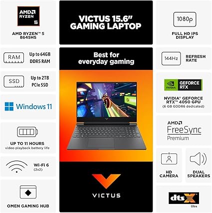 HP Victus 15.6 Ryzen 5 RTX 4050 Premium Gaming Laptop, 15.6" FHD 144Hz, AMD Ryzen 5 8645HS (Beats Intel i7-1355U e Intel i5-14400F), NVIDIA GeForce RTX 4050, 32GB DDR5 RAM, 1TB SSD, KB retroiluminada,