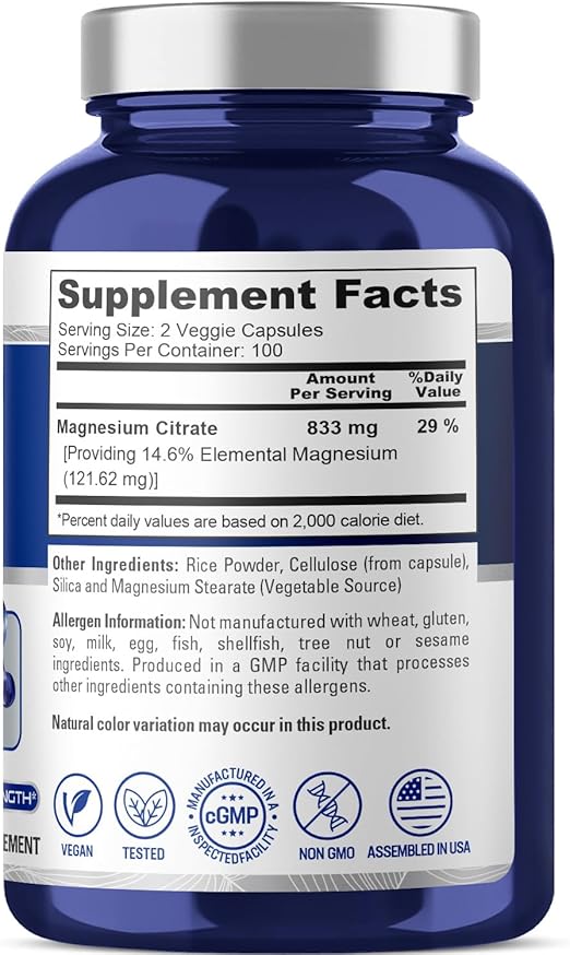 - Suplemento de citrato de magnesio de máxima resistencia 833 mg de citrato de magnesio por porción