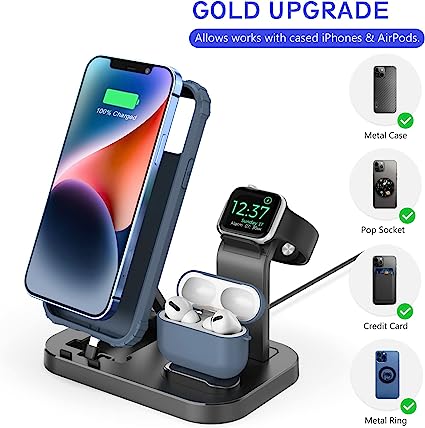 - Estación de carga compatible con fundas con el soporte ajustable de hasta 120° y respaldo giratorio de 360°, la estación de acoplamiento es adecuada para fundas de iPhone que son de silicona/metal/magnéticas o con un enchufe desplegable, cartera/tarjetero de crédito; también sirve como soporte para teléfono para iPhone/iPad/iPad mini u otros teléfonos celulares, lo que permite que tus productos Apple se sientan vertical u horizontalmente y soporta múltiples escenarios de uso como FaceTiming, ver videos, etc.