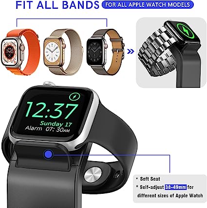 - Asiento suave que soporta bandas pesadas no hay necesidad de quitar la correa de metal de tu reloj antes de cargarlo. El soporte de silicona para reloj de nuestro cargador de reloj puede soportar correas pesadas y no se caerá mientras se carga. Compatible con Apple Watch Series Ultra/8/7/Pro/6/5/SE2/SE/4/3/2/1/1ª generación (1.496 in ~ 1.929 in).