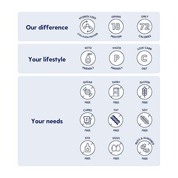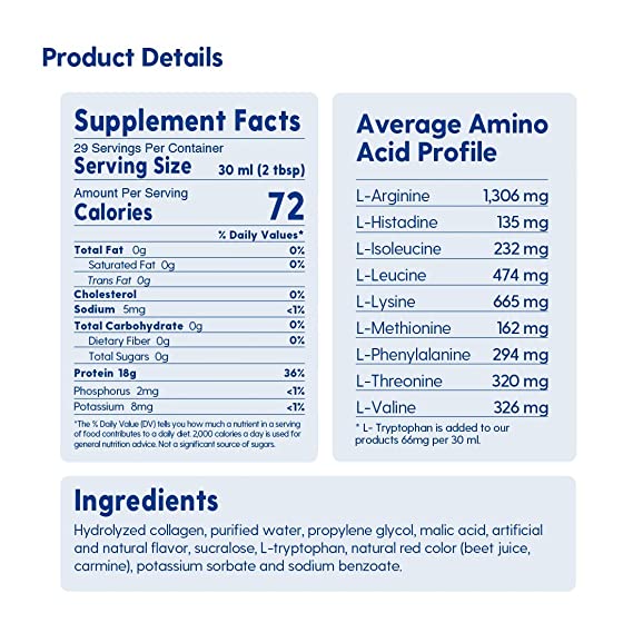 - KETO AND PALEO FRIENDLY This lean source of liquid hydrolyzed protein contains 18g of protein and 18,000mg of collagen per serving, only 72 calories. Formulated with clean ingredients and only what your body needs, no proprietary blends, you can ensure that it has no carbs, fats, and sugars, GMO, gluten, as well as artificial dyes and preservatives.