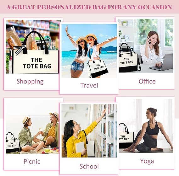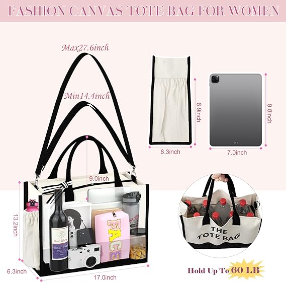 - Duradero y de gran capacidad la bolsa de lona para playa para mujer está hecha de 100% algodón natural de 16 onzas, puede soportar 60 libras, mucho más fuerte que nuestros competidores. La bolsa (17 x 13.2 x 6.7 pulgadas) es lo suficientemente espaciosa como para guardar alimentos, alimentos, ropa, zapatos, maquillaje, laptop, revistas y otros artículos para el uso diario. Se puede utilizar como bolsa de almacenamiento de comestibles, bolsa de compras o gimnasio, bolsa de viaje o bolsa de playa. Ideal para camping, viajes por carretera, picnics, fiestas de pijamas o una bolsa de fácil acceso