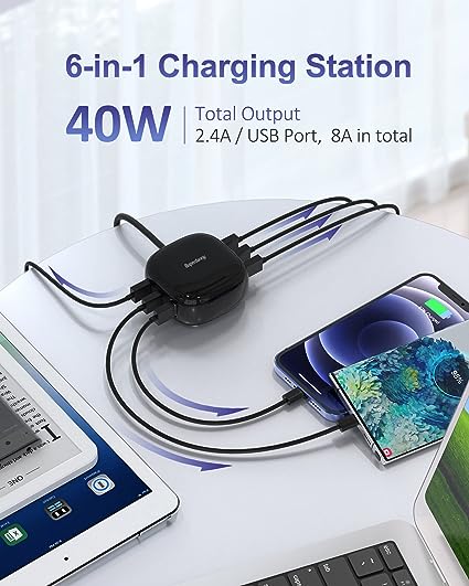 - Estación de carga USB de 6 puertos este cargador USB múltiple con 6 puertos de carga USB inteligentes detecta tus dispositivos automáticamente y ofrece la carga más rápida posible de hasta 2.4 A por puerto, totalmente 8 A/40 W, más que suficiente para la configuración de múltiples dispositivos.