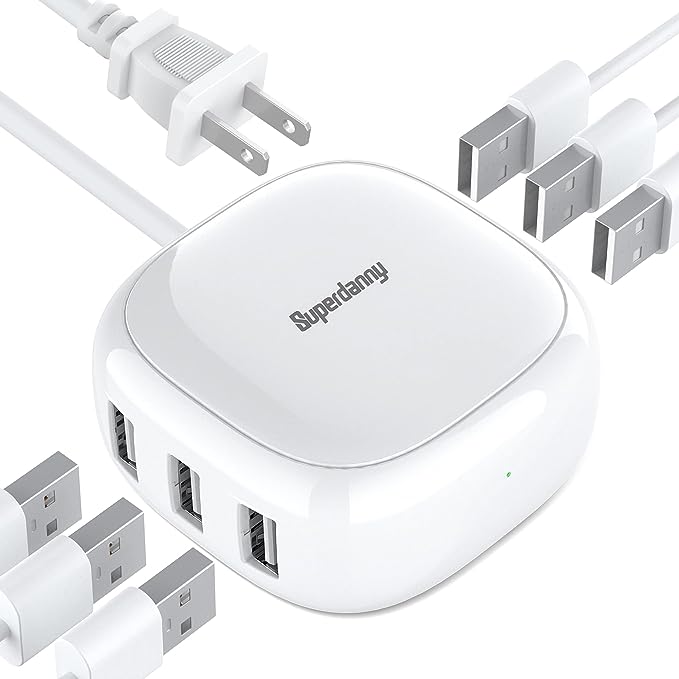 SUPERDANNY Cargador USB de 6 puertos, mini estación de carga USB de 40 W 8 A, estación de carga para múltiples dispositivos, cable de 4 pies, compatible con iPhone, iPad, galaxia, píxeles, para viajes, crucero, blanco