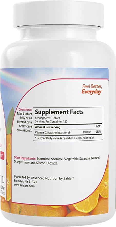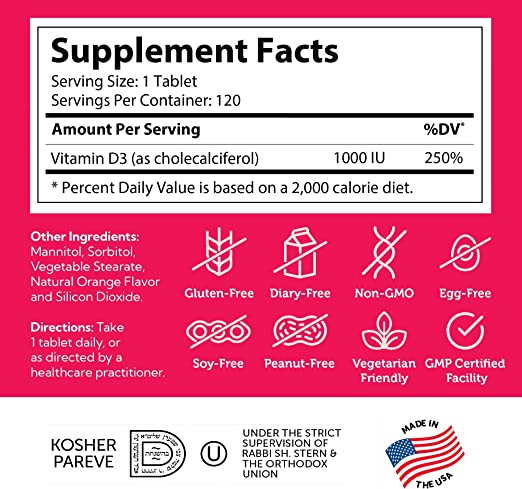 Tabletas masticables de vitamina D3, de 1000IU, para niños. Fácil digestión, con la dosis justa de vitamina D3 para niños de 1000 IU. Con certificado Kosher. 120 tabletas masticables.