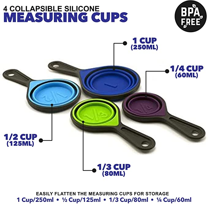 - 4 vasos medidores de silicona desplegables 1 taza/8.5 fl oz, ½ taza/4.2 fl oz, 1/3 taza/2.7 fl oz, ¼ taza/2.0 fl oz. Se aplanan fácilmente las tazas para su almacenamiento