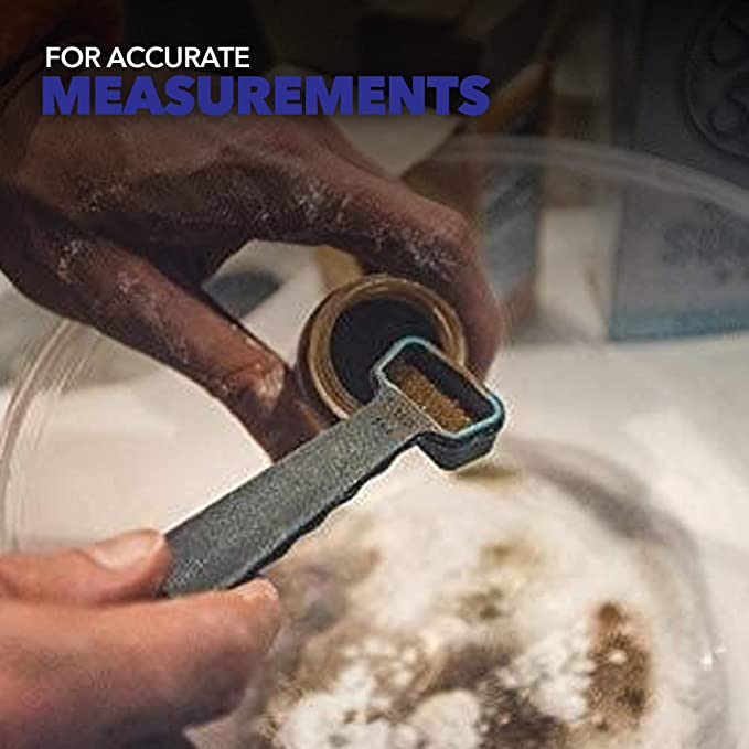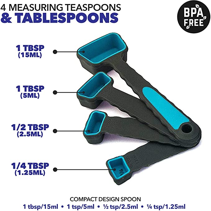 - 4 cucharas medidoras de silicona y cucharillas de té 1 cucharadita / 0.5 fl oz, 1 cucharadita / 0.2 fl oz, ½ cucharadita / 0.1 fl oz, ¼ cucharadita / 0.0 fl oz. Cuchara de plástico de diseño compacto